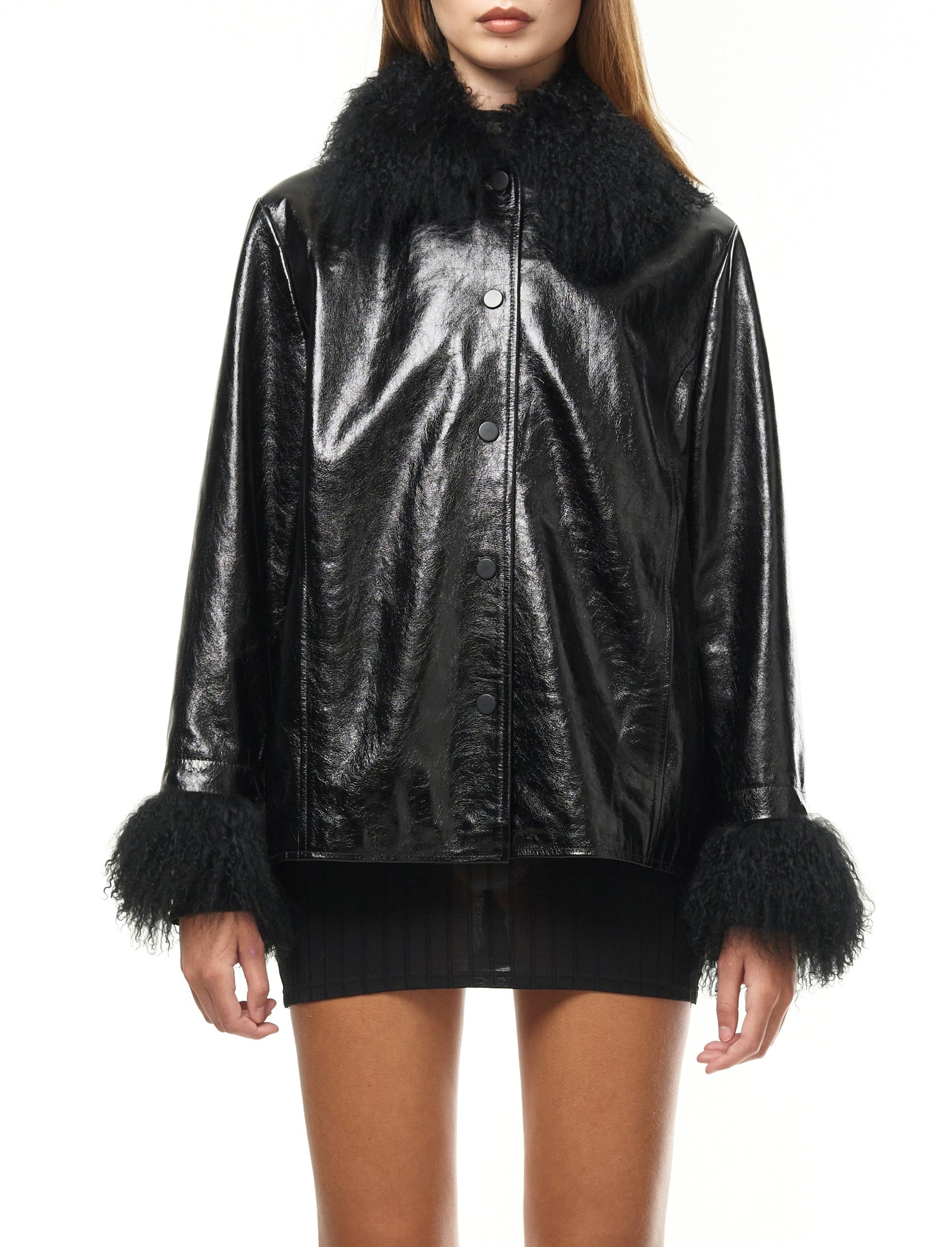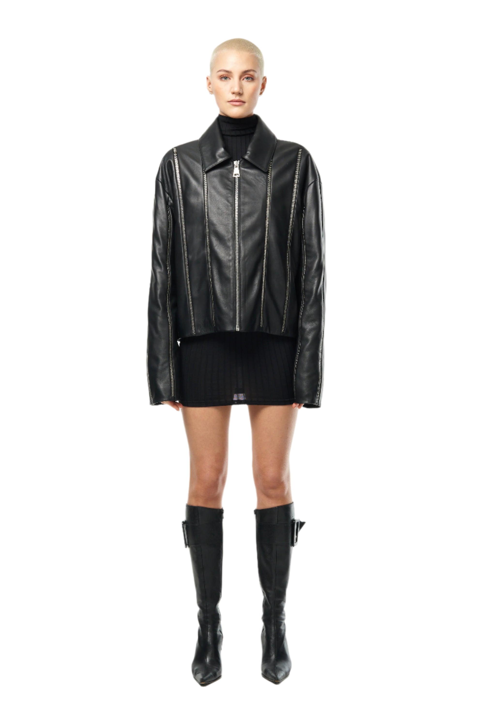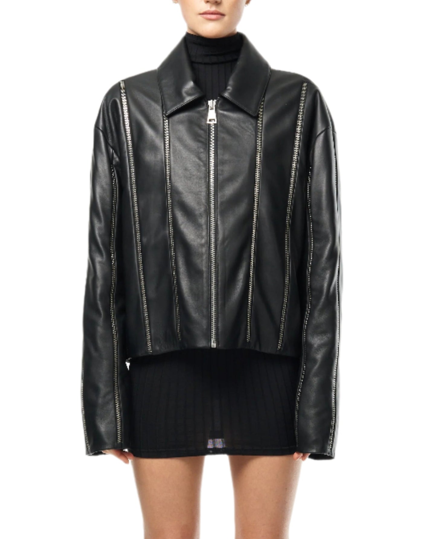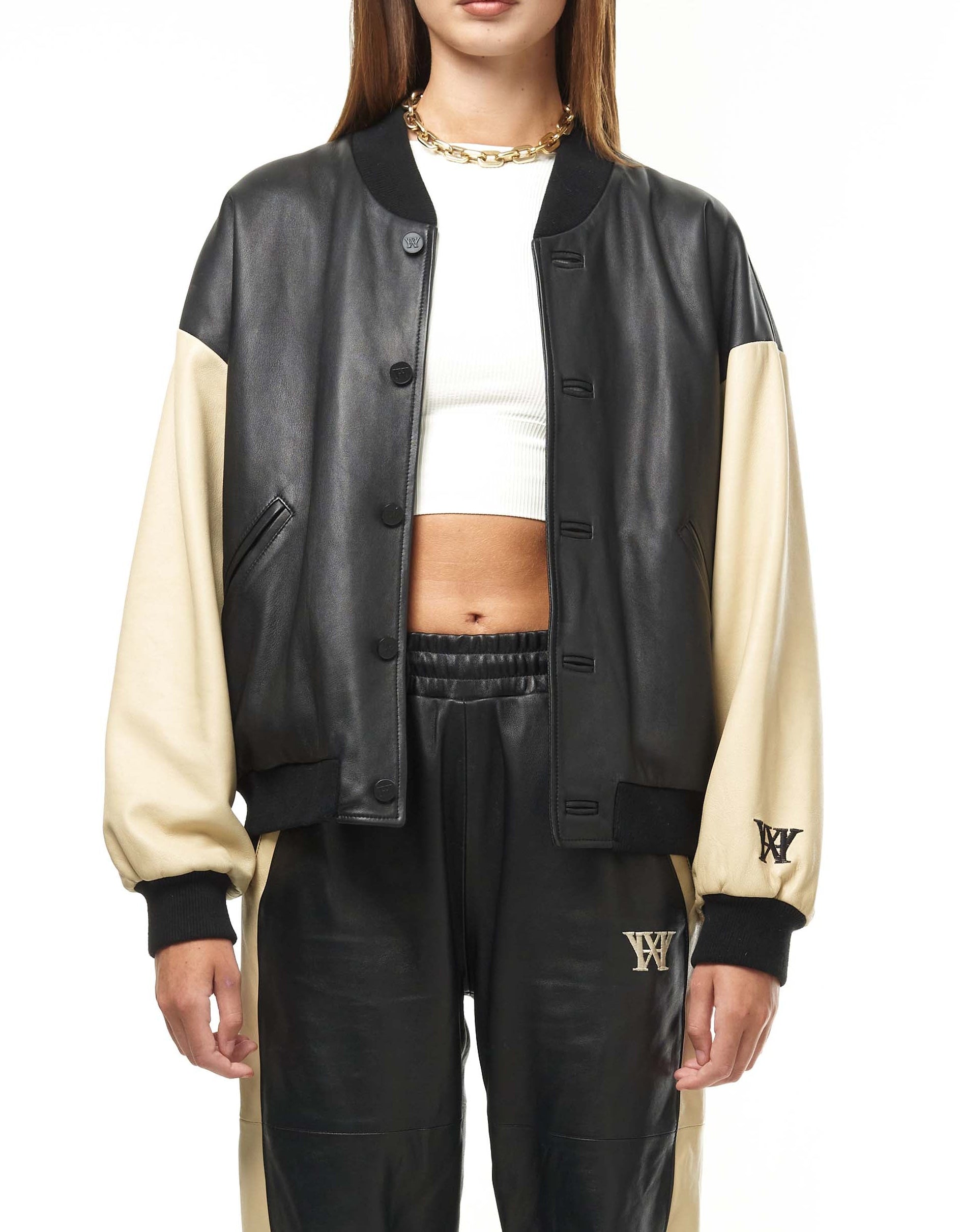 THE SQUAD LEATHER BOMBER IN BLACK AND CREAM