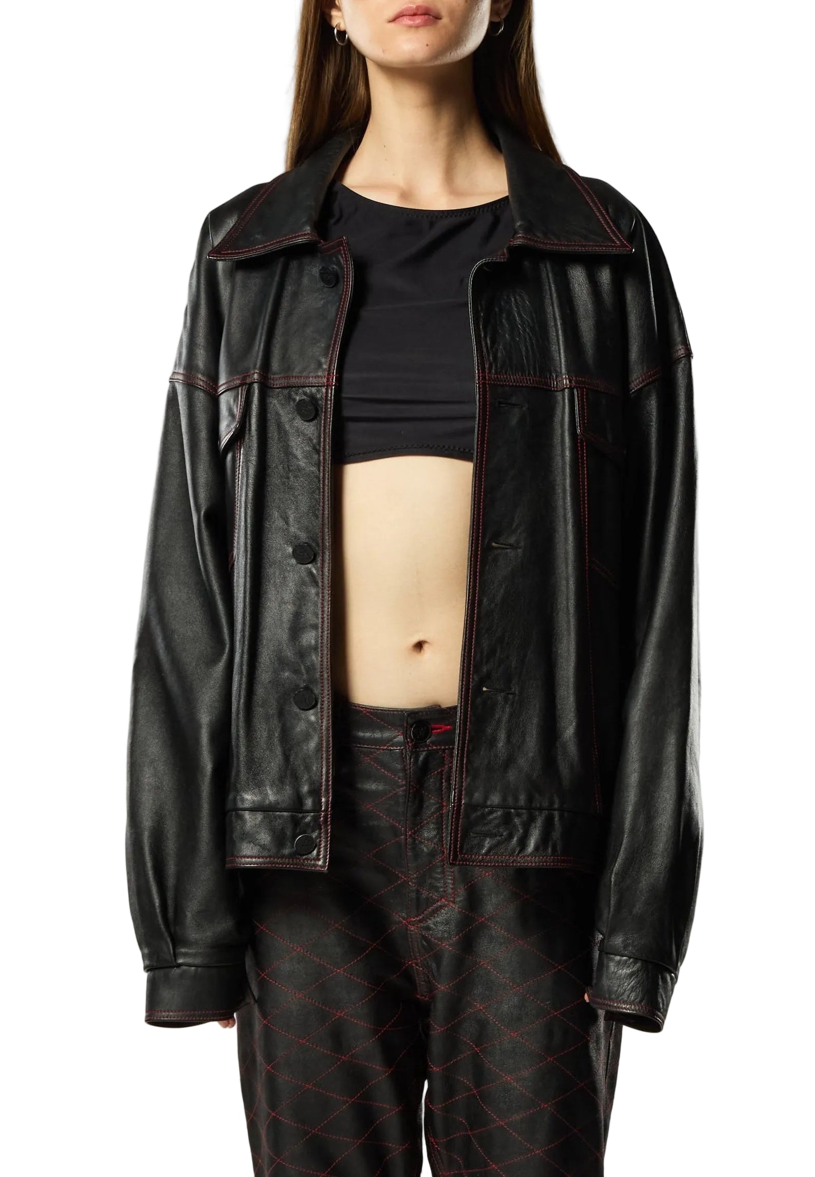 MIDNIGHT LEATHER TRENCH W // RED CONTRAST STITCH