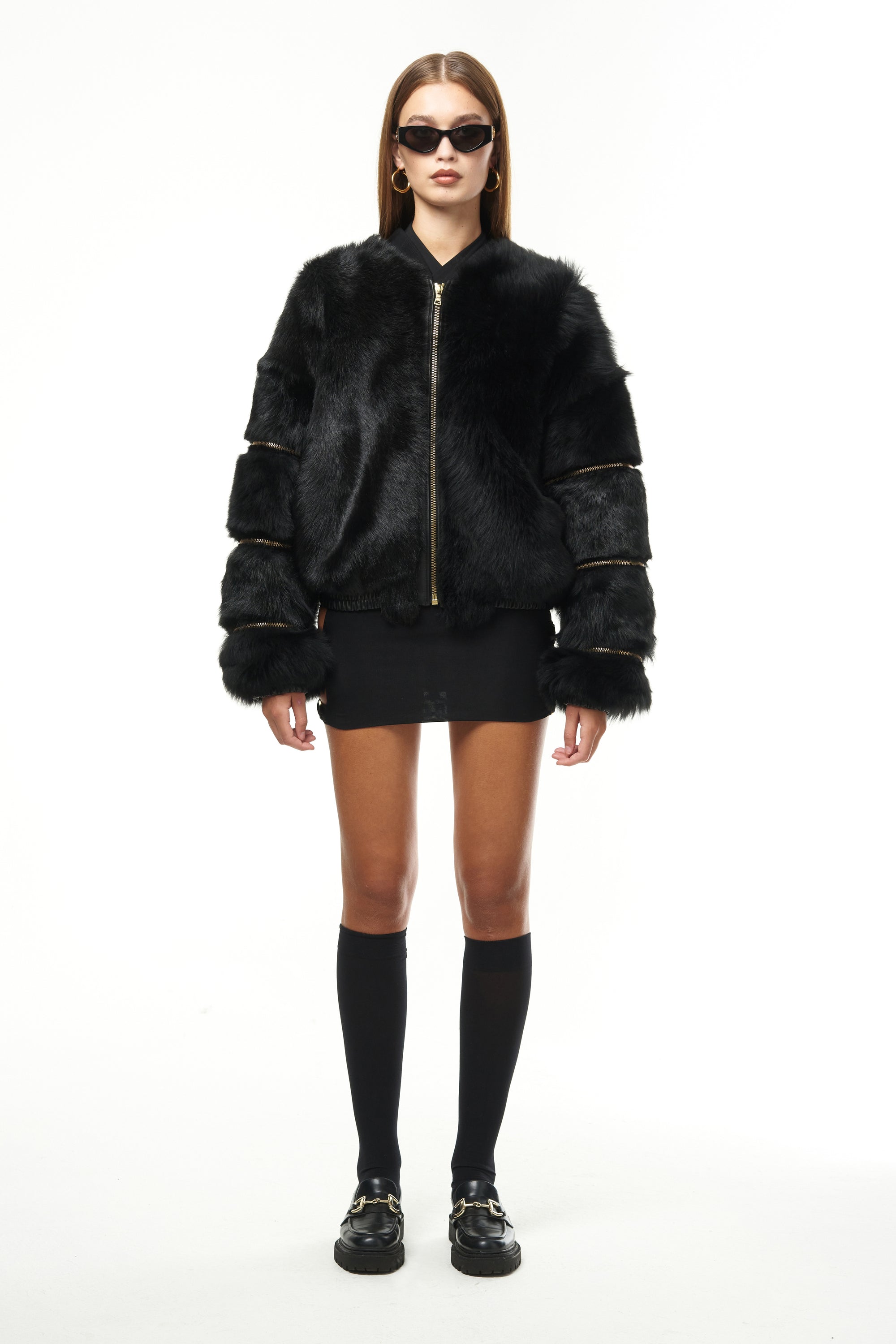 UNISEX DENIM BOMBER JACKET WITH MONGOLIAN FUR HOOD - PRE ORDER