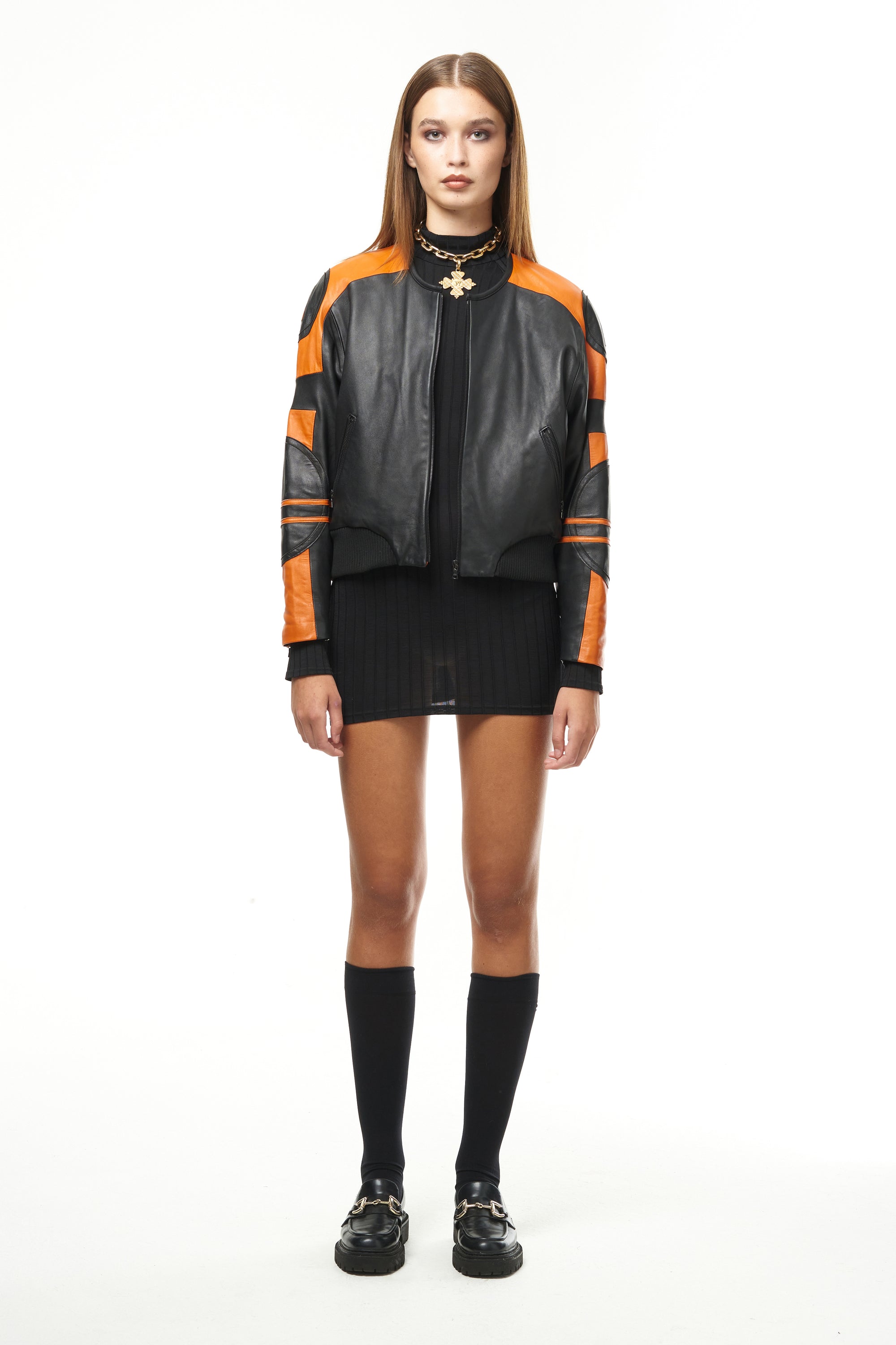 BLACK & ORANGE LEATHER RACER BOMBER JACKET 003